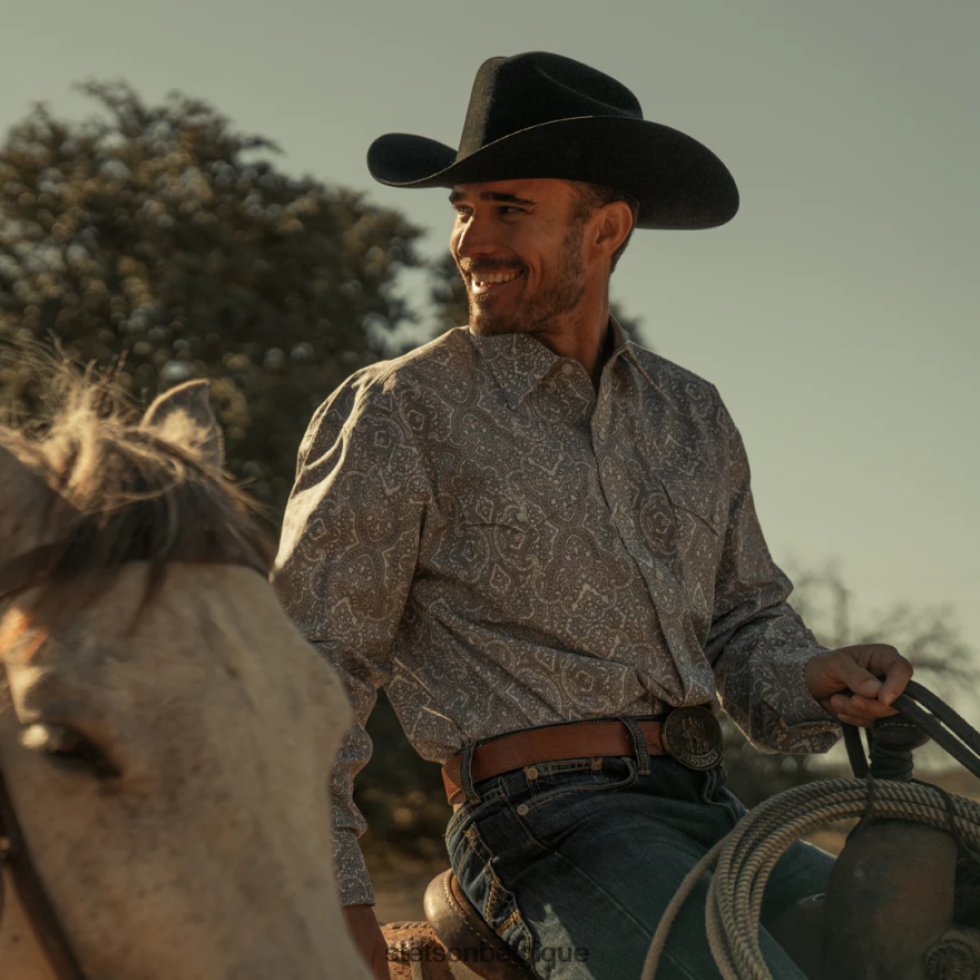 Véritable incontournable du gentleman, le stetson el patron a une présence majestueuse difficile à ignorer. Impeccablement fabriqué à partir de luxueux feutre de fourrure 30x, il est à la fois remarquablement doux et suffisamment durable pour durer toute une vie. le style ovale classique du bouvier est accentué par un subtil bandeau en feutre, teint de la même couleur que le corps du chapeau. le bandeau lui-même est rehaussé par une boucle en trois parties en argent sterling sur laquelle sont inscrites les initiales de notre légendaire fondateur – John B. stetson – et détaillé avec une superposition d’or discrète et des pierres incrustées. à l’intérieur, une doublure en satin et un bandeau en cuir offrent un confort parfait, que vous ayez passé toute la journée sur le terrain ou dans les rues de la ville. Fièrement fabriqué aux États-Unis, c’est un chapeau qui vous accompagnera à travers toute une vie d’aventures.