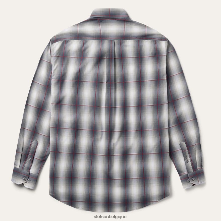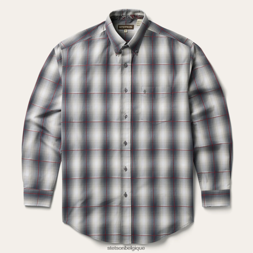 cette chemise boutonnée est confectionnée à partir d’un plaid ombré teint en fil avec des rayures en satin. il comporte un empiècement arrière droit avec pli et triple couture, un logo stetson « s » en relief sur la poche avant gauche et « stetson » en relief sur la patte de manche droite. il présente une bordure intérieure contrastée et un poignet à bord en onglet réglable à deux boutons. le devant boutonné classique est orné de boutons à logo en perles et il est fabriqué en 100 % coton pour plus de qualité et de respirabilité.