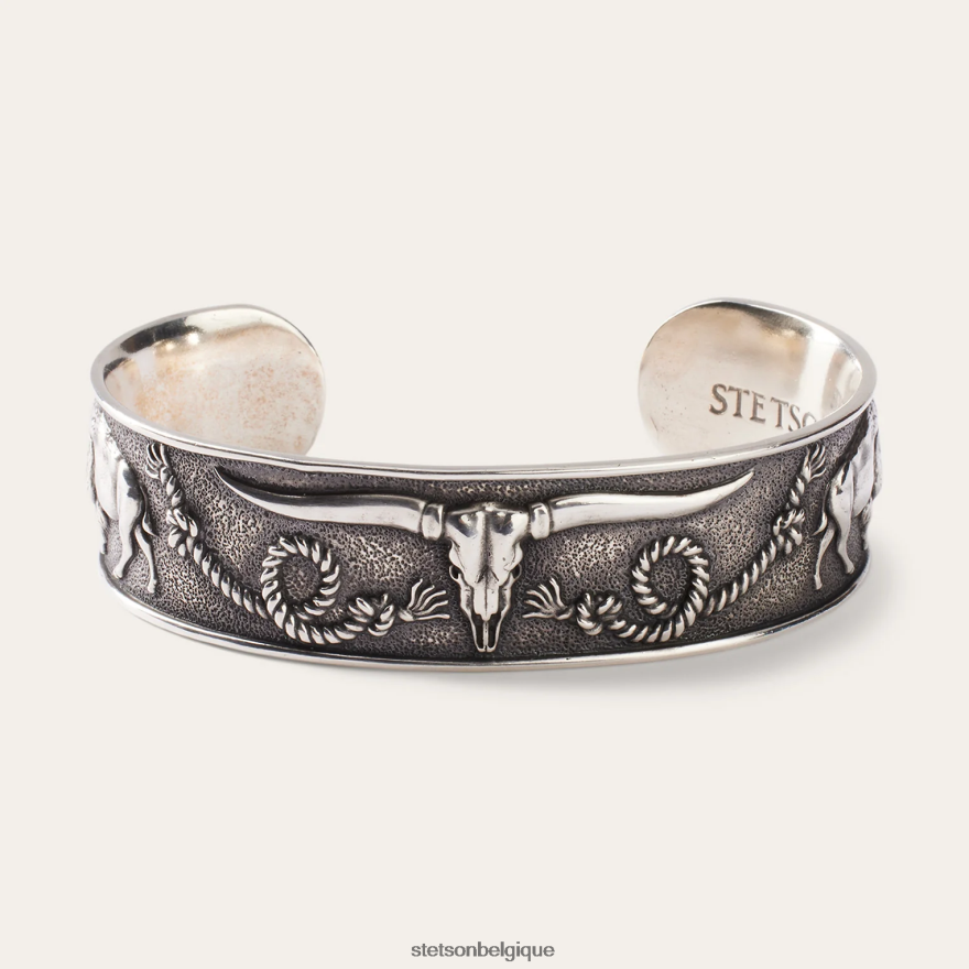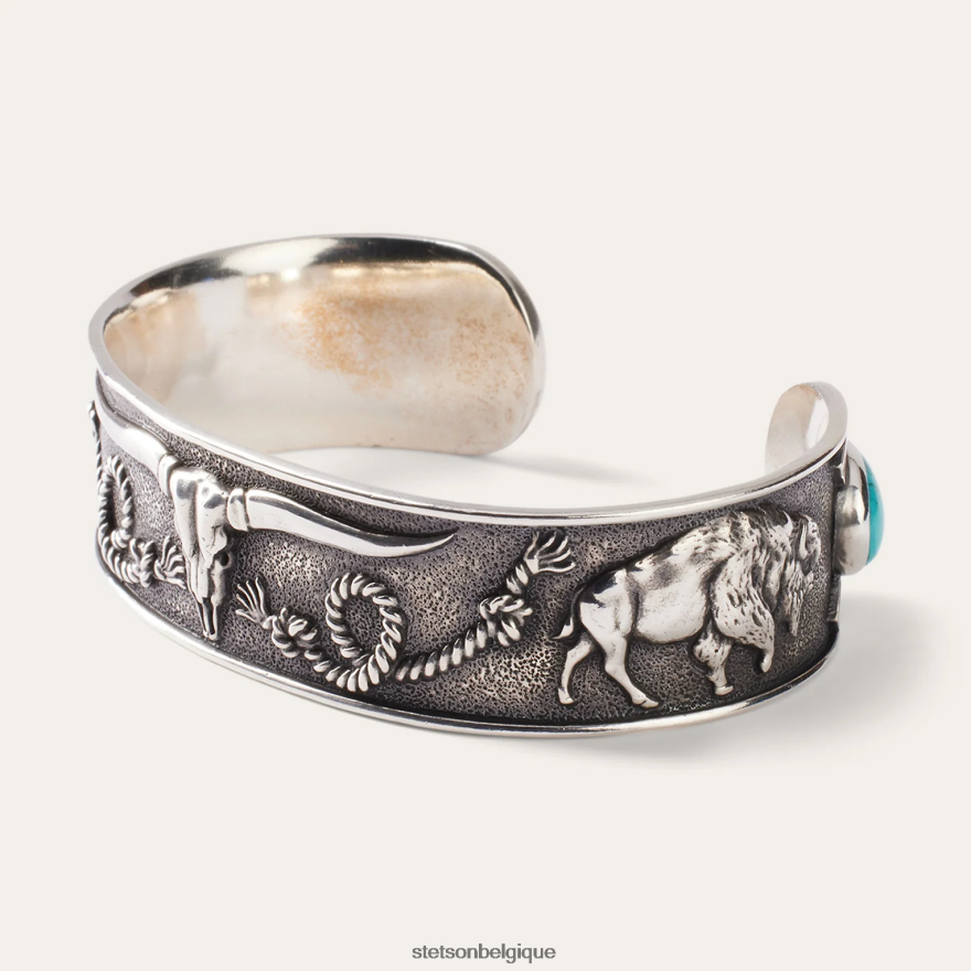 des motifs americana classiques décorent ce brassard d’inspiration sud-ouest. le crâne d’un longhorn se trouve à l’avant et au centre de la face du brassard, flanqué de cordes nouées, de buffles et de fers à cheval. Véritablement ornée, cette manchette capture tous les éléments emblématiques de l’esprit robuste du sud-ouest. portez-le seul ou superposez-le à d’autres pièces pour un look classique.