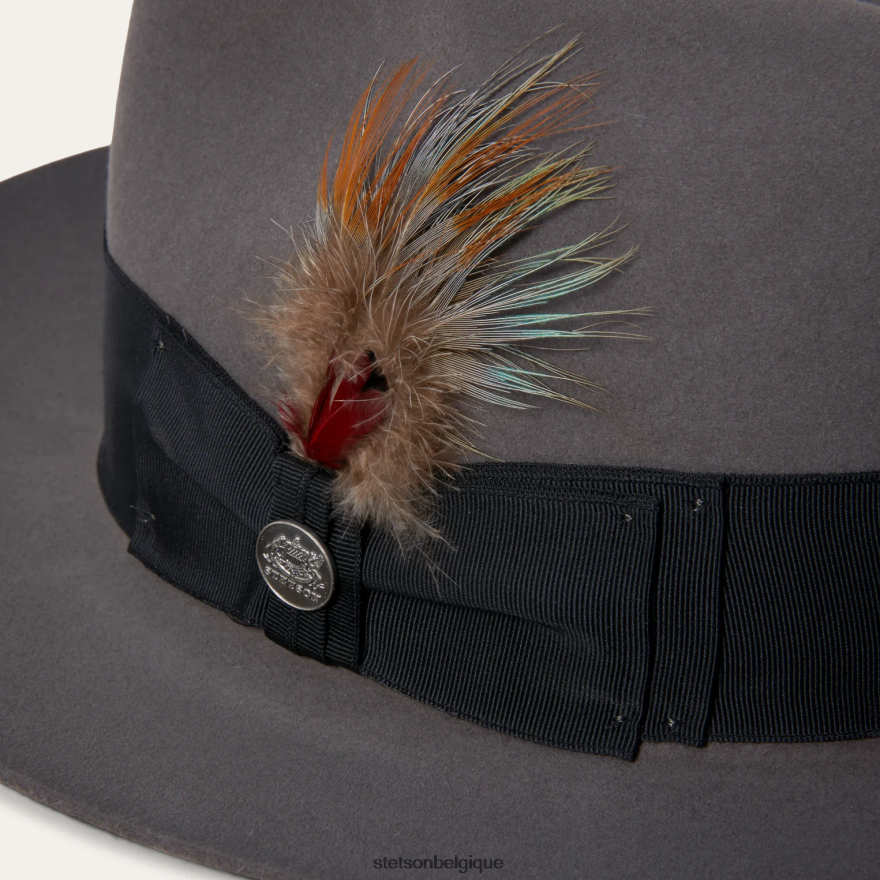 un clin d’œil aux bars de jazz des années 1940 à New York. icône à part entière, le temple est une déclaration de style distinctif. fabriqué à partir de feutre de qualité, il comporte une couronne avant pincée au centre et une large bande de chapeau en ruban gros-grain joliment compensée par un accent de plume audacieux. à l’intérieur, un bandeau en cuir rouan et une doublure en satin estampillée de la marque Stetson complètent le tout.