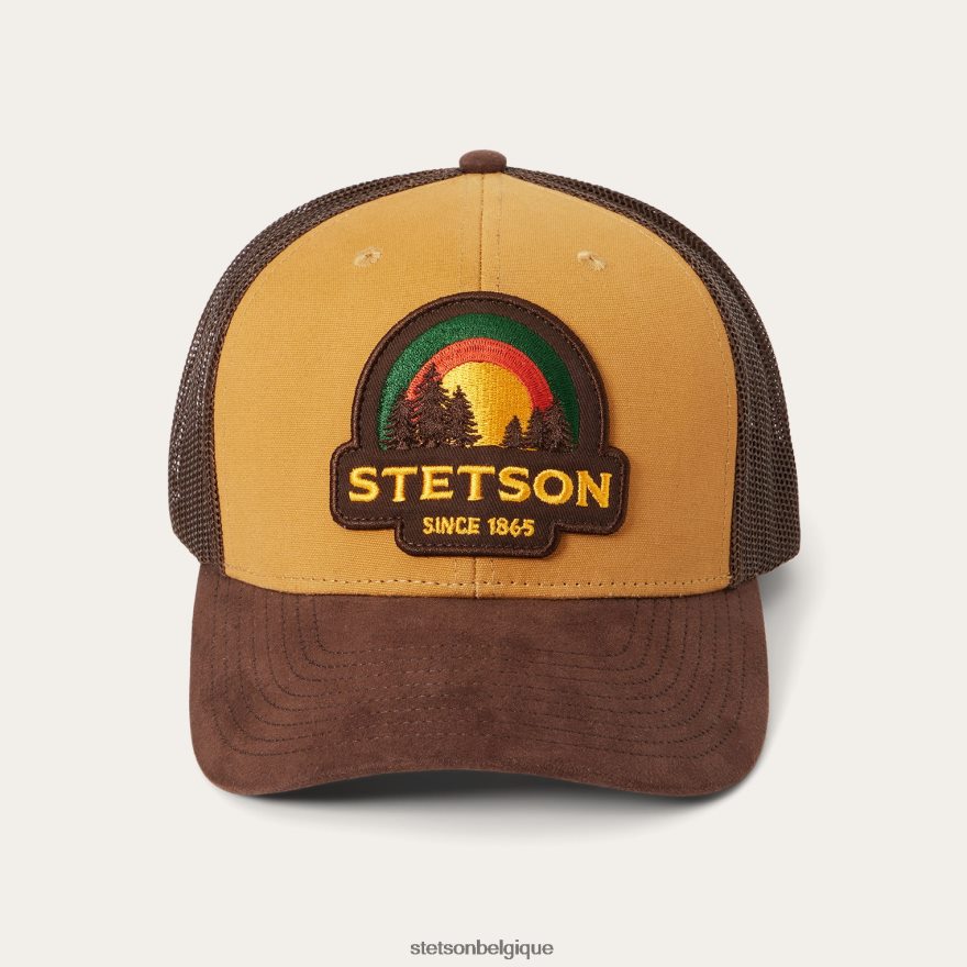 Cette casquette de camionneur classique présente un logo Stetson Sunset brodé aux couleurs vives. confectionné avec un devant en toile brossée robuste, il possède un dos en mesh pour la respirabilité et la ventilation, une visière légèrement incurvée et une fermeture classique à bouton-pression à l’arrière pour garantir un ajustement sûr et réglable.
