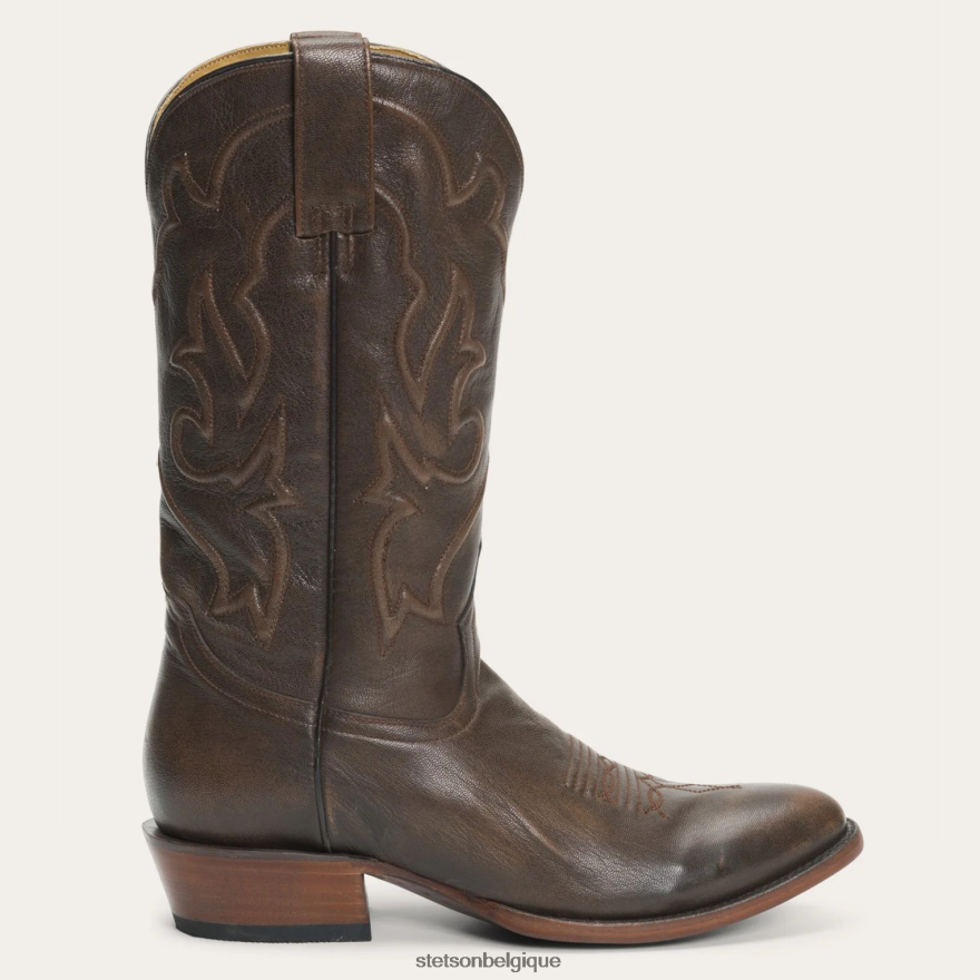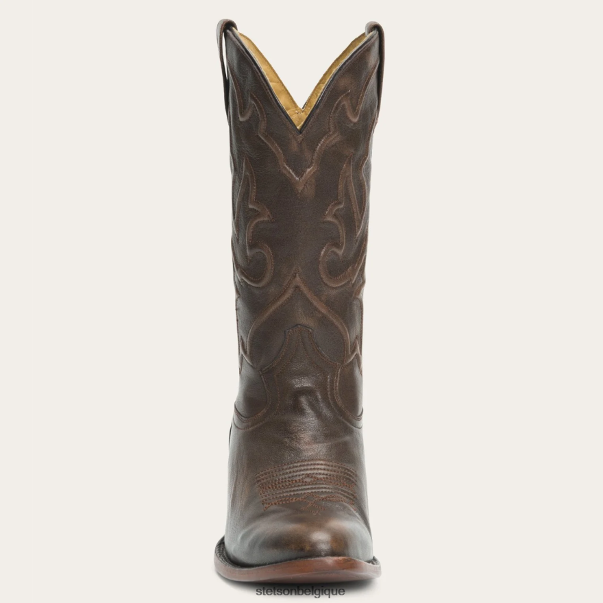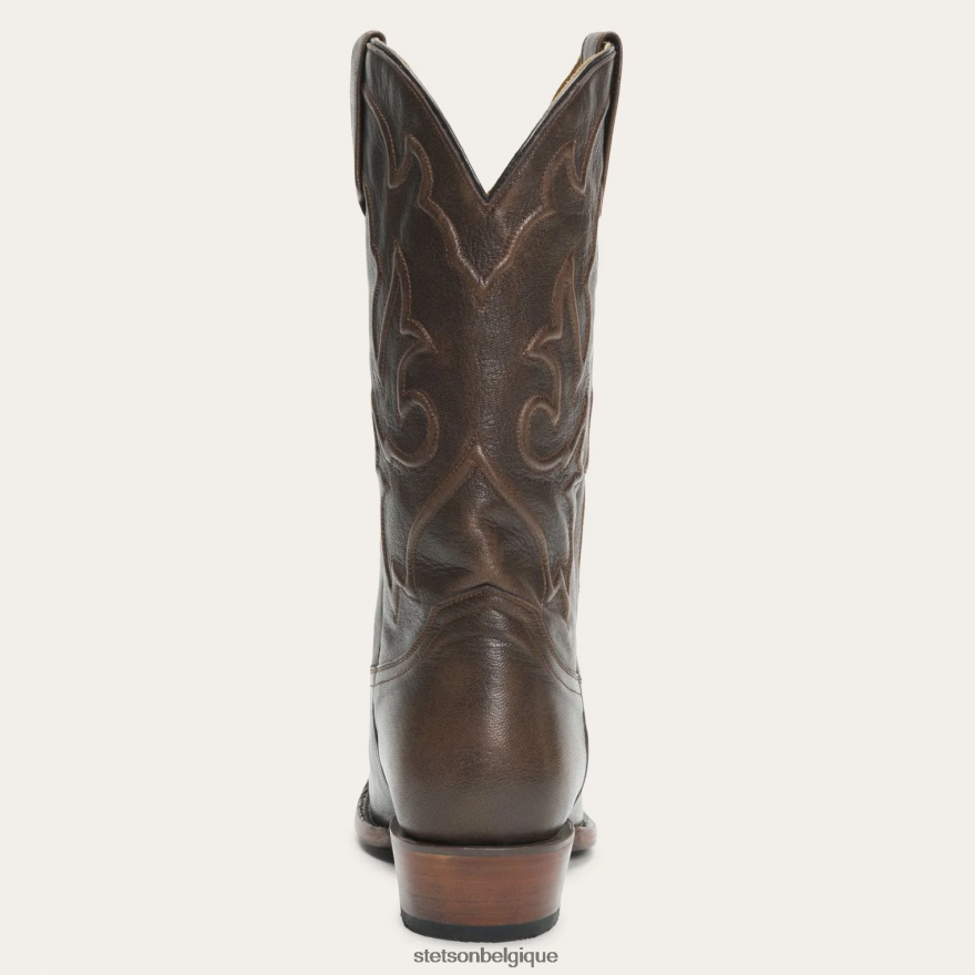 fabriqué à la main par les légendaires bottiers de Stetson à partir de cuir de vache de première qualité conçu pour se patiner joliment au fil du temps. Les caractéristiques comprennent une doublure sans couture en vache de qualité supérieure, des semelles intérieures True X amovibles, des clous en laiton et des piquets en bois de citronnier actionnés à la main qui permettent à la botte de résister aux éléments en se dilatant et en se contractant avec toute humidité que la botte peut rencontrer.
