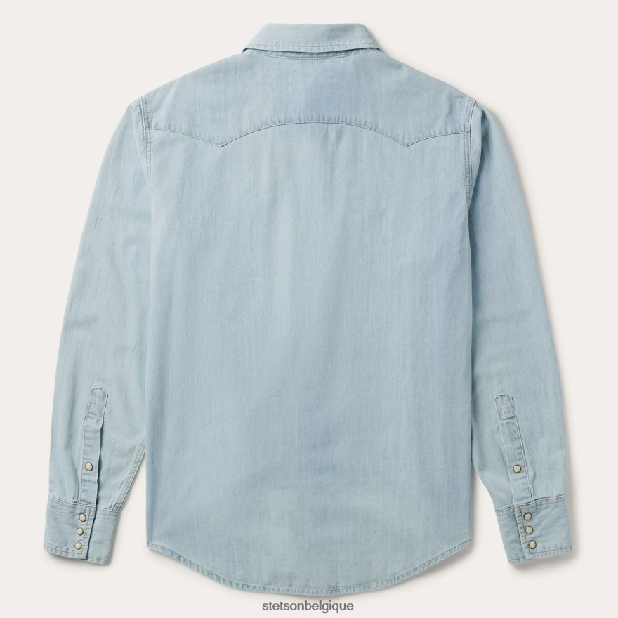 Cette chemise bleu clair de style western est confectionnée dans un denim 100 % coton sablé pour un look usé. il a un empiècement arrière incurvé à deux points et des rabats de poche incurvés à deux points avec un « s » stetson en relief sur la poche avant gauche et un « stetson » en relief sur la patte de manche droite. le devant classique à boutons-pression comporte des boutons-pression à logo, tandis que le poignet à trois boutons-pression offre un ajustement sécurisé. coupe ajustée et moderne pour un mélange parfait de confort et de style.