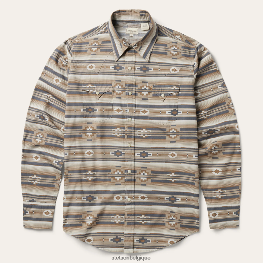 Cette chemise western présente un imprimé aztèque horizontal d’inspiration sud-ouest et est confectionnée à partir d’une popeline de coton légère et durable qui a été lavée en pièce pour une sensation vécue. il comporte un empiècement avant et arrière incurvé en un seul point, un logo à bouton-pression sur le devant et trois poignets à bouton-pression. la poche avant gauche est embossée du logo stetson « s » et la patte de boutonnage de la manche droite est embossée « stetson ». Bordure coupée pour une coupe moderne, c’est un mélange parfait de style et de confort.