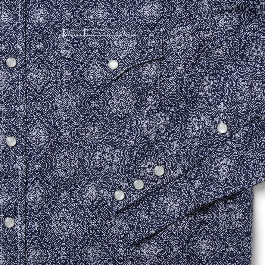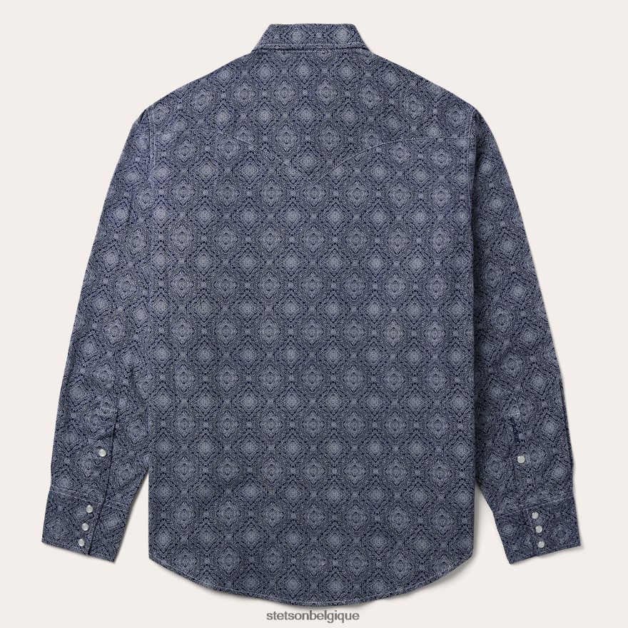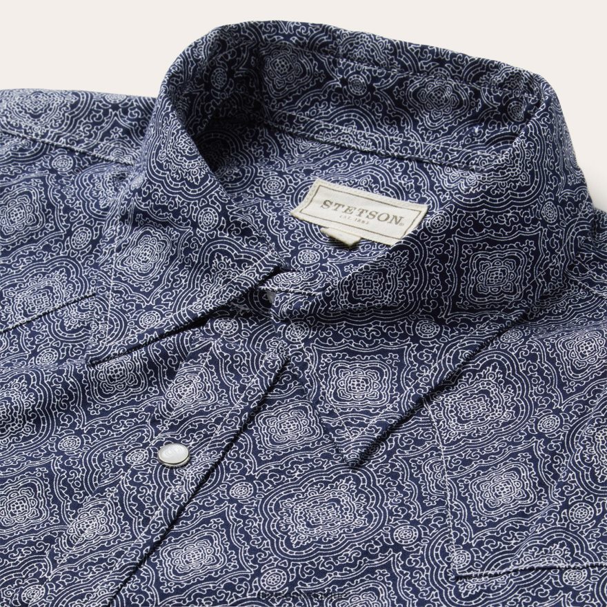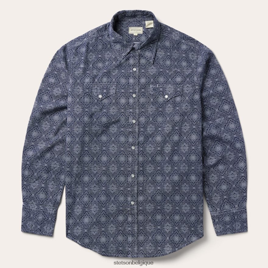Cette chemise western classique présente un imprimé médaillon d’inspiration vintage sur toute la surface et est confectionnée dans une popeline de coton impeccable qui a été lavée en pièce pour une sensation douce qui ne fera que s’améliorer avec le temps. il est doté d’un empiècement arrière incurvé à un point, d’un logo en perles sur le devant et de trois poignets à boutons-pression. le logo stetson « s » est embossé sur la poche poitrine gauche et « stetson » est embossé sur la patte de boutonnage de la manche droite. bordure coupée, pour une coupe moderne, c’est le mélange parfait de style et de confort.