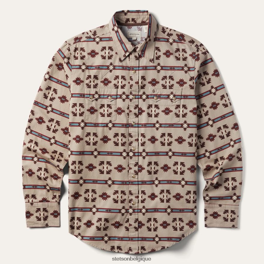 Cette chemise western présente un imprimé audacieux à rayures gaucho d’inspiration aztèque et des détails authentiques comme un bouton-pression sur le devant avec des boutons-pression à logo kaki varié, un empiècement arrière incurvé à deux points et un poignet à trois boutons-pression. Les logos Stetson subtilement embossés sur la poche poitrine et la patte de manche ainsi qu’un col renforcé ajoutent encore plus de style et de durabilité. Coupée avec une coupe moderne pour un look soigné, la chemise est faite d’un sergé de coton robuste qui tombe bien tout en gardant sa forme et ne s’améliore qu’avec le temps.