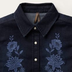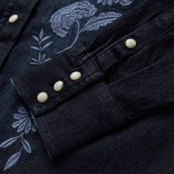ce chemisier à manches longues en denim foncé est confectionné dans un mélange de coton doux avec juste une touche de stretch pour faciliter les mouvements et a été lavé en pièce pour une sensation de confort. le devant de la chemise présente un superbe détail floral brodé bleu bleuet qui est une expression accrocheuse du style d’inspiration occidentale. D’autres caractéristiques authentiques incluent un empiècement arrière incurvé à un point, trois poignets à boutons-pression et un devant classique à boutons-pression.