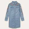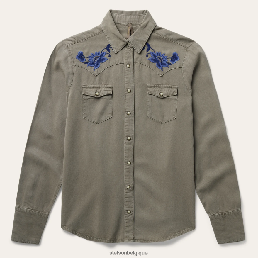 ce chemisier coupe boyfriend de style western est confectionné à partir d’un sergé de denim 100 % lyocell durable qui a été teint en fil dans un riche ton olive. un superbe détail floral brodé bleu marine et bleuet est présenté sur les empiècements avant et arrière incurvés à un seul point de style occidental traditionnel. de faux rabats de poche, une fermeture classique à bouton-pression sur le devant et un passepoil complètent ce haut unique et élégant.