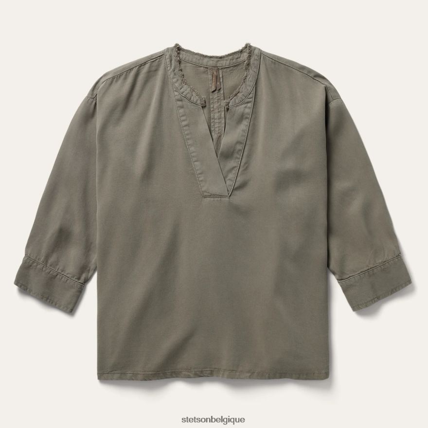 ce haut paysan en lyocell olive est confectionné à partir d’un sergé de denim 100 % lyocell durable qui a été teint en fil dans une riche couleur olive. il présente un col en V flatteur avec un traitement de col à bord brut, un ourlet inférieur à bord fini et des manches 3/4 avec des poignets à un bouton. un pli au centre du dos améliore la coupe pour un haut décontracté d’inspiration western, idéal pour le soir ou au quotidien.