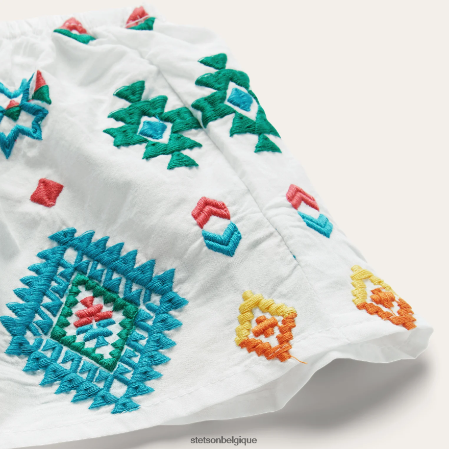 coloré, léger et polyvalent, ce haut en coton blanc est brodé de notre motif Schiffli vif rouge, jaune et turquoise. ce modèle élégant à épaules dénudées est doté d’une bande élastique en haut de l’encolure pour un ajustement sûr et confortable. Fabriqué à partir d’un tissu lisse 100 % coton blanc de haute qualité, ce haut léger d’inspiration occidentale est idéal pour tout rassemblement par temps chaud.