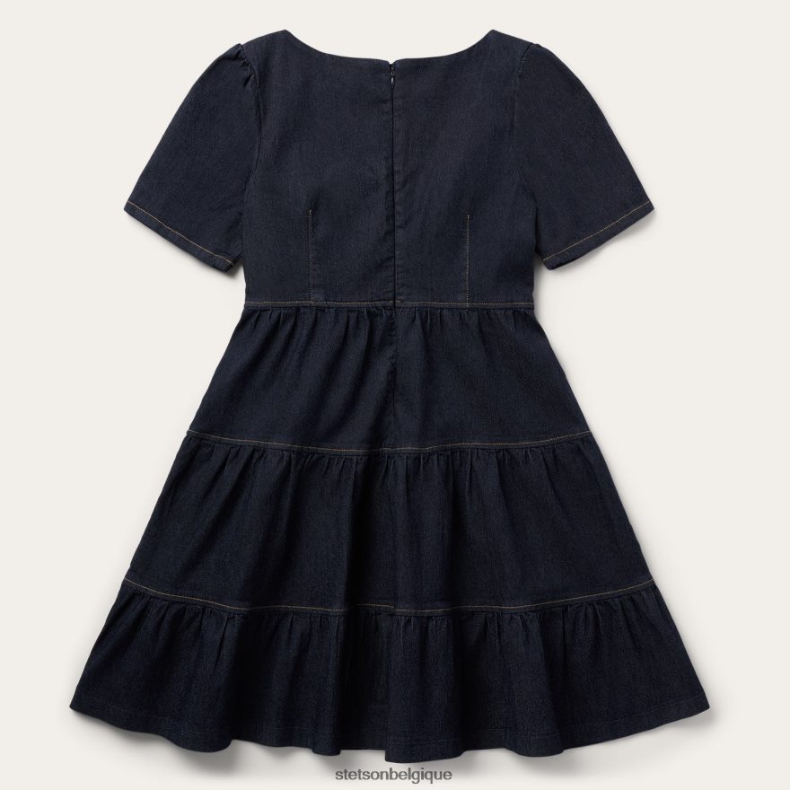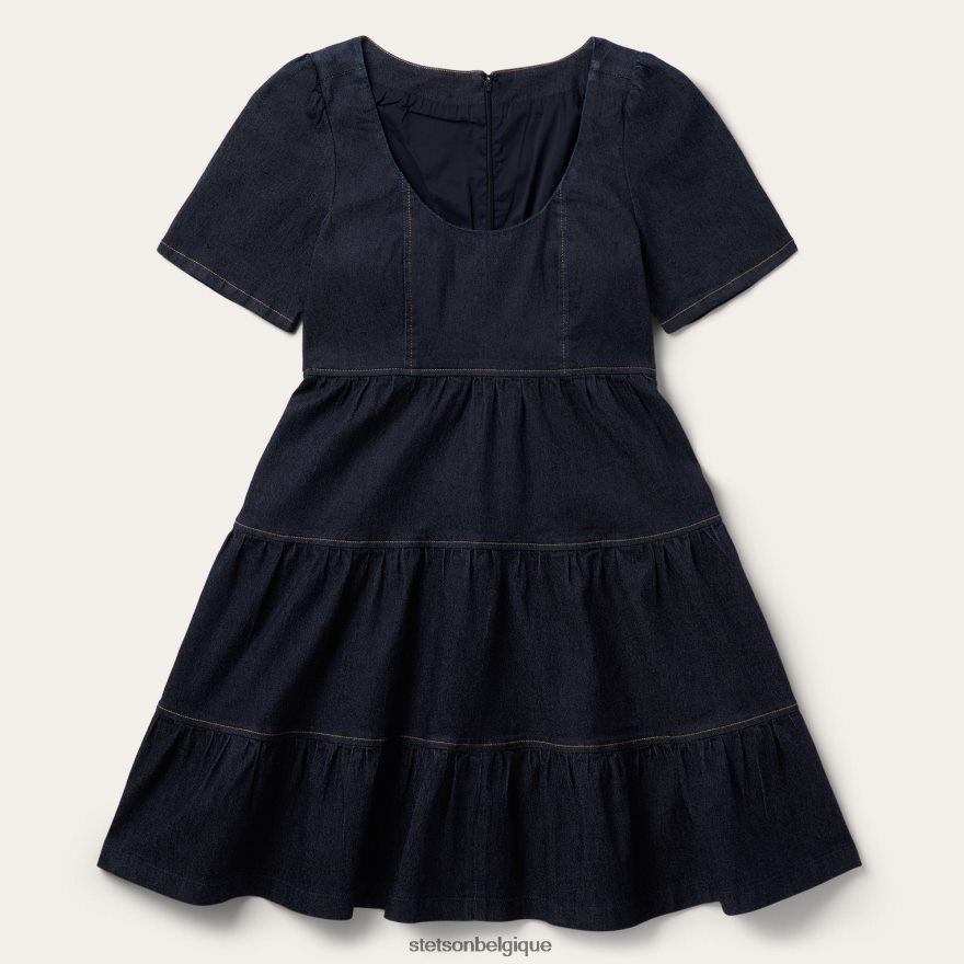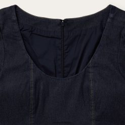 Pièce élégante et polyvalente pour toute garde-robe, cette robe en jean foncé est confectionnée dans un mélange de coton doux avec juste une touche de stretch pour faciliter les mouvements et a été lavée en pièce pour une sensation de confort. il comporte un corsage empire à coutures princesse et une jupe à trois niveaux, des manches courtes froncées au niveau des épaules et une fermeture éclair invisible au dos pour assurer un ajustement parfait. les surpiqûres contrastées ajoutent un style authentique d’inspiration western, tandis que la longueur au-dessus du genou laisse suffisamment de place pour les bottes western.